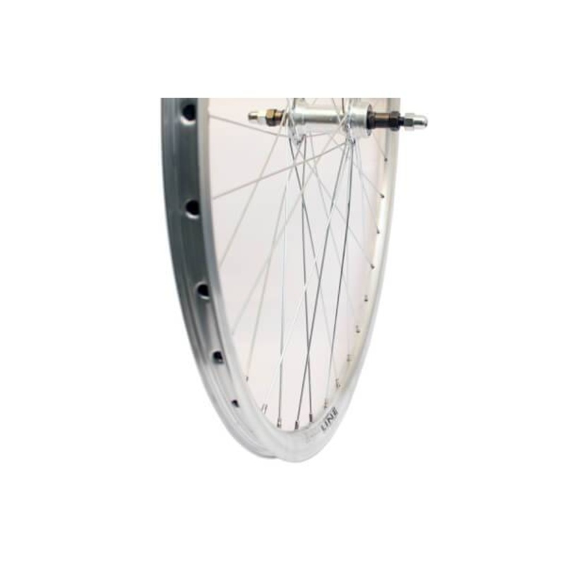 This rear wheel is carried out with a solid axle (nut mount) and is suitable for a 5, 6, 7, 8, and 9 fold free-wheel or screw-on tooth wheel.