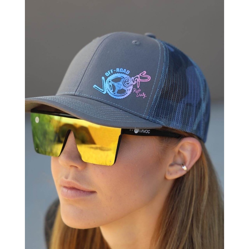 The perfect trucker hat for those beach and boat days. Charcoal front with blue camo mesh back with our blended ride dirty logo on left front.