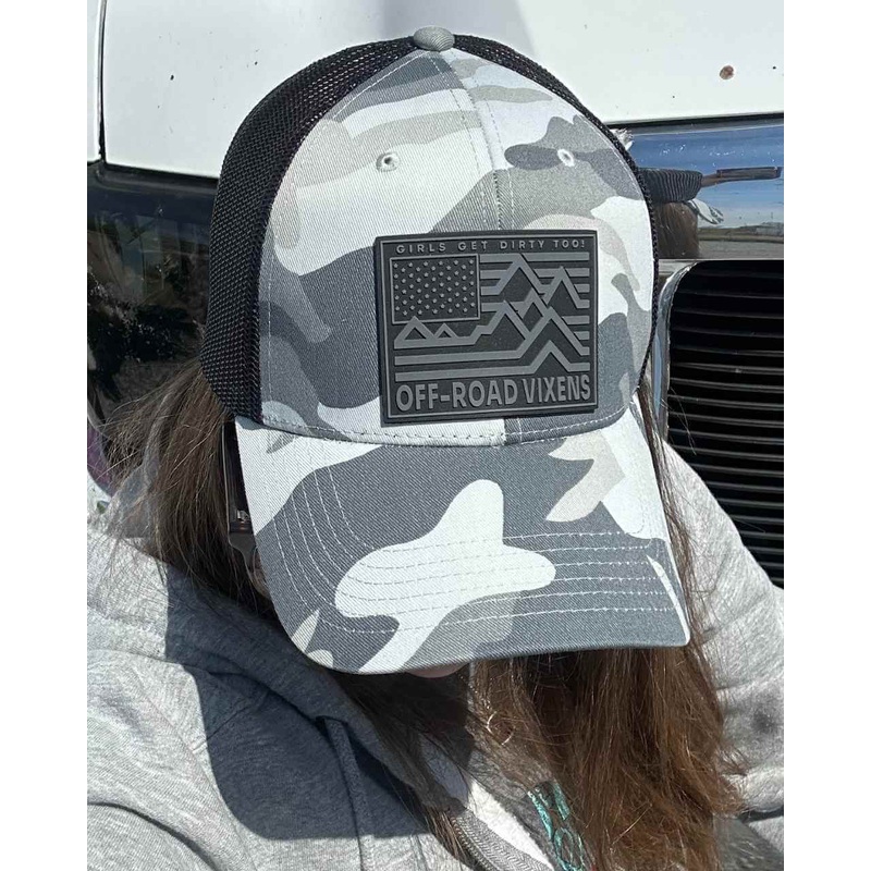 Our hot pick for the summer season! Gray camo low profile trucker with our new patriotic Ride Free rubber patch.