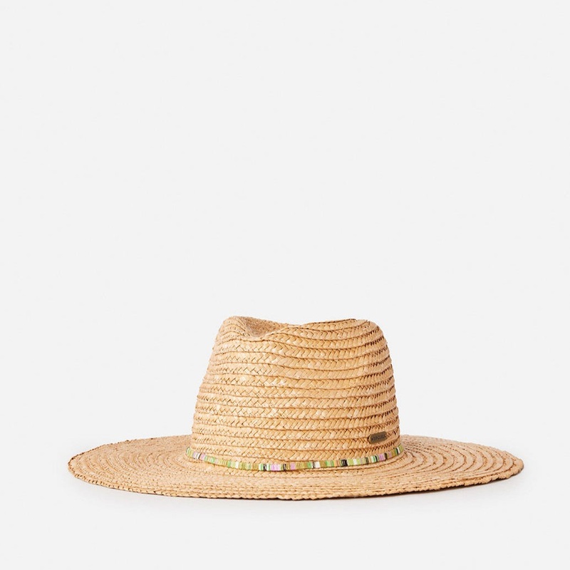 A classic with a twist, this Panama hat is crafted from wheat grass straw and designed with a wide brim for stylish sun protection. The narrow striped headband with lurex highlights adds a touch of sparkle, while the subtle metal badge and structured desig