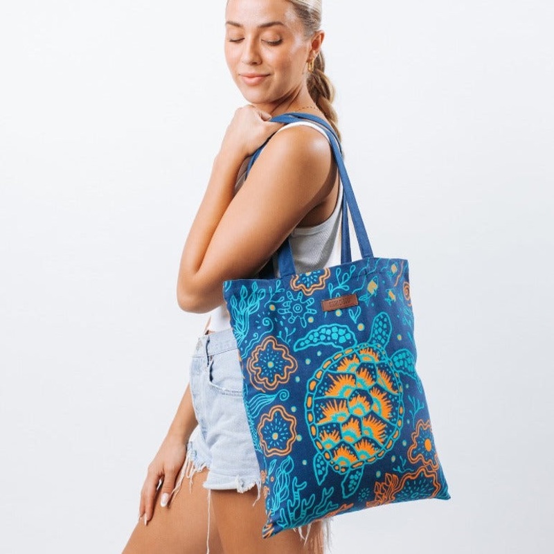 Stay stylish and eco-friendly with our Sand Cloud Reef Turtles Everyday Beach Tote! Made from 100% organic cotton, this tote is perfect for any beach or pool day. Show your love for sea turtles while supporting small and local businesses. A must-have for a