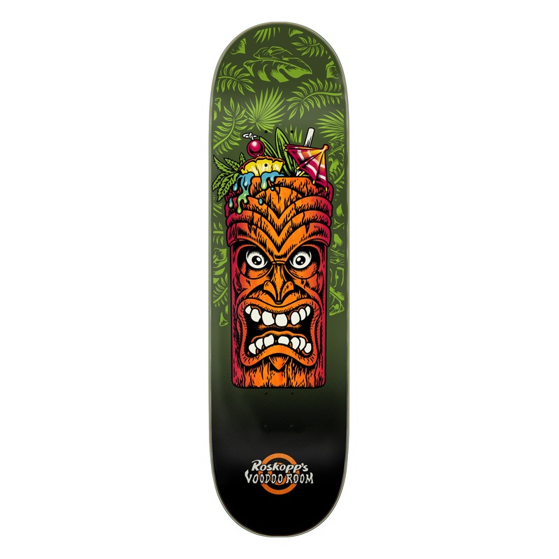 Santa Cruz Roskopp Tiki Mug 8.5" Skateboard DeckSanta Cruz Skateboards Roskopp Tiki Mug deck featuring matte graphics with green fade and orange veneer reveal.7 ply North American Maple pressed individually using epoxy - making a strong, responsive deck wi