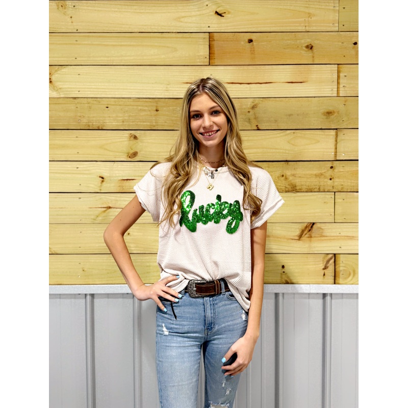 95% POLYESTER 5% SPANDEX**SAINT PATRICK’S DAY**SHORT SLEEVE SOLID URBAN RIBBED TOP WITH LUCKY LETTER SEQUINS PATCH