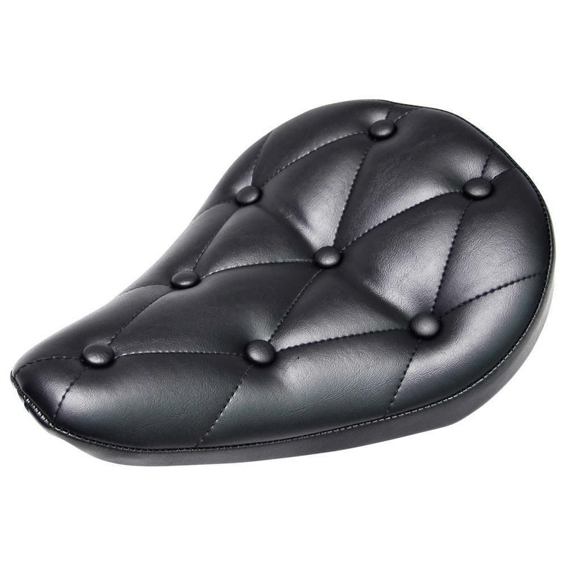 Solo motorcycle seat featuring diamond stitching and tufted buttons for that classic '70s look!Thick black steel seat panBlack vinyl coverMeasures 9" wide x 12" longApproximately 1" thick padSpring studs are 7" apart and use universal seat hinge sold separ
