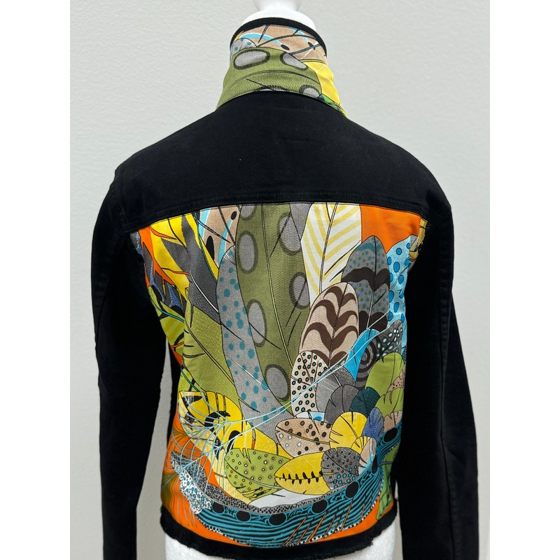 We love this Black Denim Jacket from Stacy Bradley Design for its unbeatable comfort and sleek style. Lightweight with plenty of stretch, it moves with you throughout your day. The striking orange feather detail adds a unique touch that sets it apart. Mach
