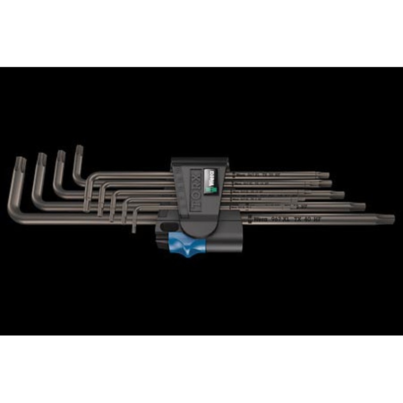 High quality L-keys for recessed TORX screws. Comes with a holding function: the wedging forces resulting from the contact pressure between the drive tip and the screw profile securely hold the screws on the tool at both ends. The BlackLaser surface treatment provides outstanding corrosion protection and a long service life. “Take it easy” Tool Finder with colour coding according to size. Available in a practical clip fastener, whose wear-free material provides secure storage for the L-keys and enables simple removal.Feature: