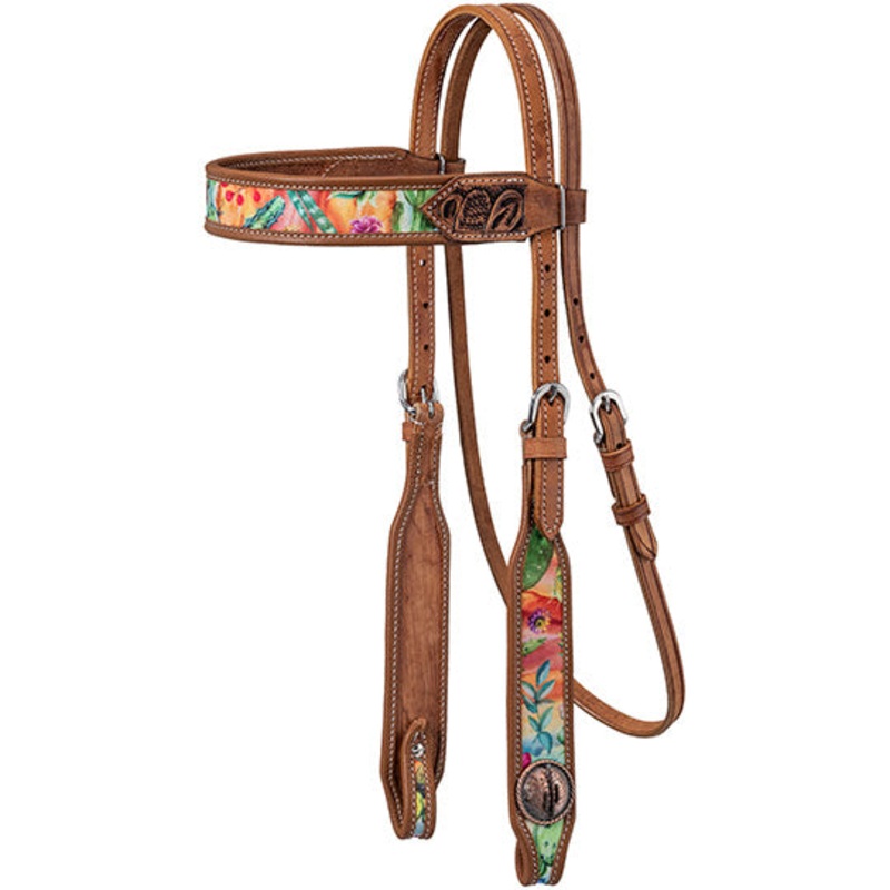 Tough 1 Cactus Print Browband HeadstallPremium-quality leatherBrowband headstallEye-catching southwestern cactus print accents on the leatherDurable stainless steel or brass bucklesNatural leather with vibrant cactus print detailsCombining the durability a
