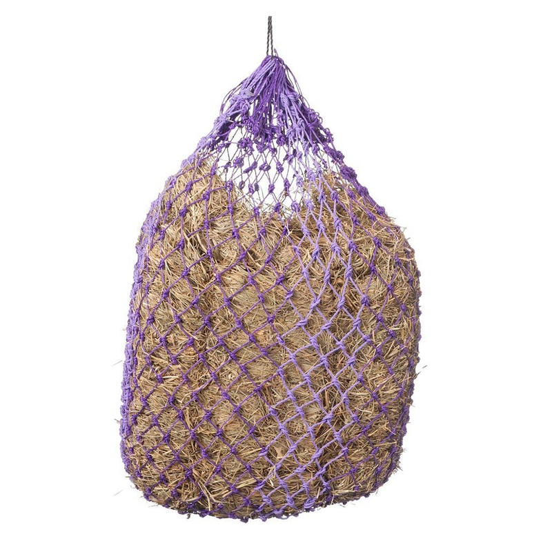 Super Strong Poly Hay Cord: Crafted from durable poly hay cord, this hay net ensures longevity and resilience, capable of withstanding the rigors of equine life. Colorful Two-Tone Design: Featuring a vibrant purple hue with contrasting tones, this hay net