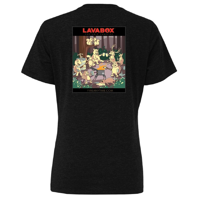 If a racoon pukes in the woods and no one is there to smell it, does it have the odor of pine beetles and Jim Beam? This awesome shirt may not have the answers to all of cosmic questions of the universe but it is super soft with a dope animal party on the back.
