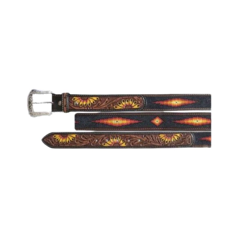 Leather Belt; Beaded Design (Pearl Black, Black, Maroon, Red, Orange, Yellow, Pearl White); Tooled Sunflower Design With Yellow And Red Painted Flowers; Silver Etched Buckle; Style #XB-3027Proposition 65 Warning for California Residents.