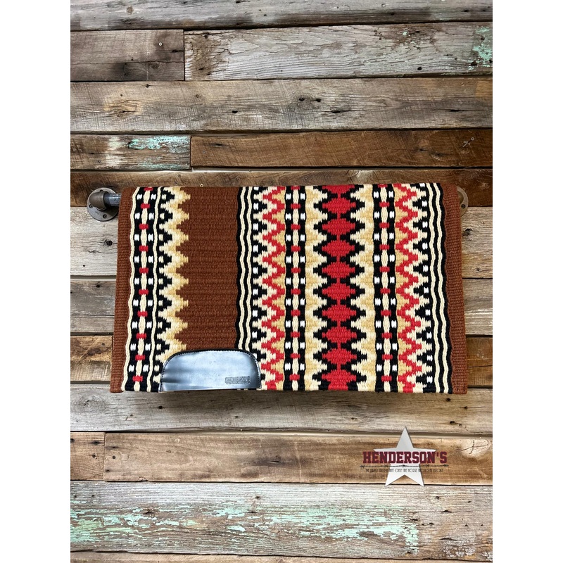 Western show pads by Henderson's. We have designed these pads to compliment your outfit in the show ring. All pads are made with 100% wool and are handwoven with wear leathers. All pad designs are copyright.Chocolate base Sheep, Red, Tan, Black & White 34x