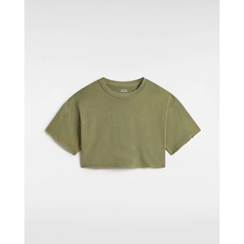 Elevate your wardrobe with the Vans Womens Relaxed Crop Wash T-Shirt in Loden Green. This shirt effortlessly combines comfort and style, showcasing a comfortable fit that exudes a laid-back vibe.