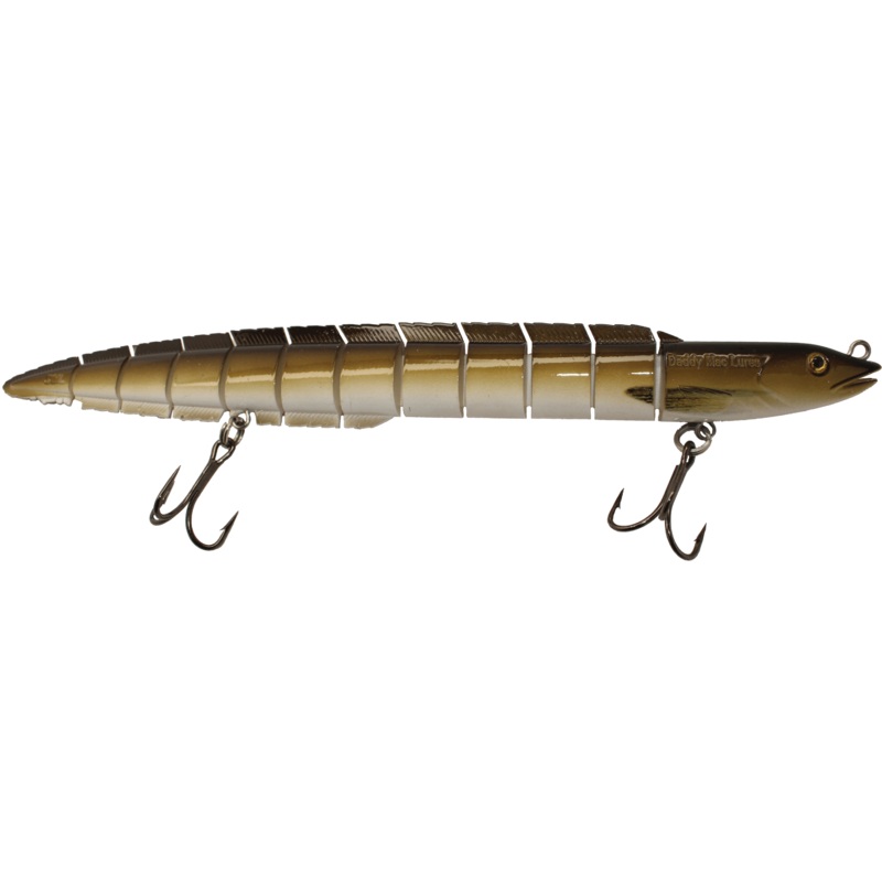 Daddy Mac Viper Eel 12'' Lures feature a 3/0 VMC 4x strong treble hook, and an unprecedented 11 Kevlar linked splits to produce a truly lifelike swimming action. Fast sinking, clacks when swims, and has an internal rattle. 3D eyes, reflective durable finis