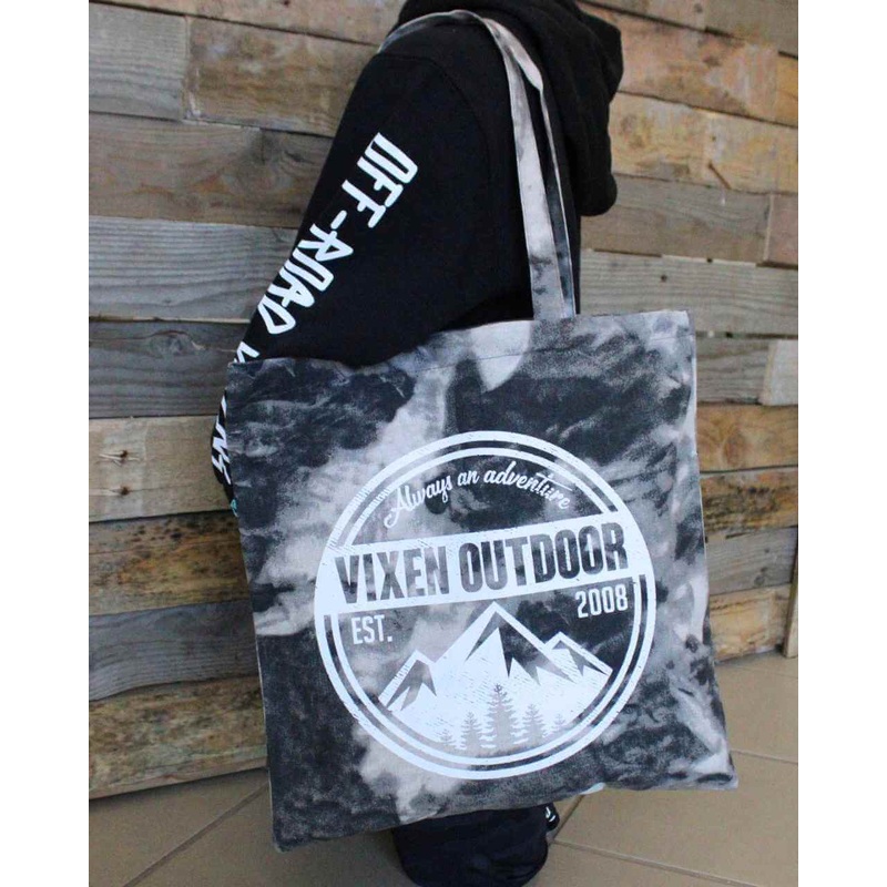 We are in love with this black and smokey gray tie-dye canvas bag, featuring the Vixen Outdoor logo on front and ORV logo on back. The perfect trackside tote bag.100% Cotton CanvasDimensions 14" W x 16" H, 9" HandlesMachine wash cold, hang dry, no bleach