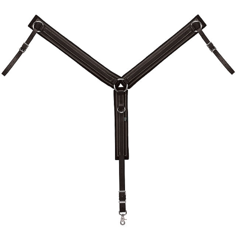This breast collar offers the look and feel of leather with the easy care and convenience of synthetic webbing. You’ll love the low maintenance and weather resistance of this breast collar. Durable nickel plated hardware. Horse size.