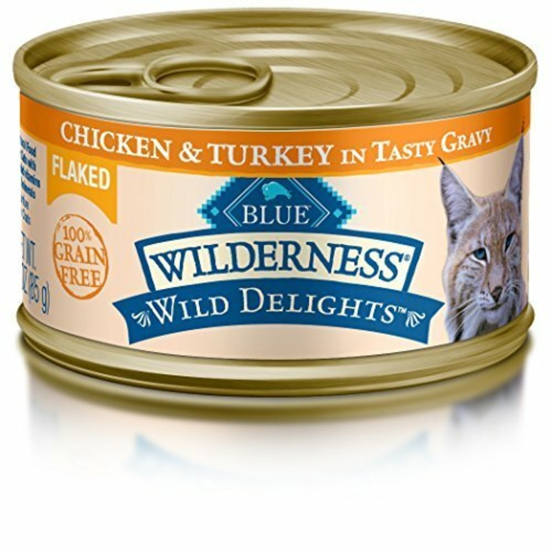 Because cats love meat, BLUE Wilderness Wild Delights Flaked Chicken & Turkey goes a step beyond our protein-rich Wilderness recipe and boasts two tasty meats for your feline to enjoy. Tender, flakes of real chicken and succulent turkey are accompanied by a rich gravy making this a true feline favorite.