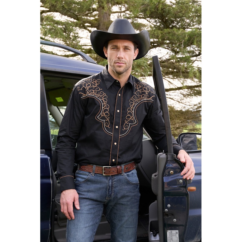 Classic western long sleeve shirt with original hand drawn embroidered front and back yokes, snap closure, piping detail (on front placket, sleeve cuffs, front and back yokes).100% CottonColor: Black