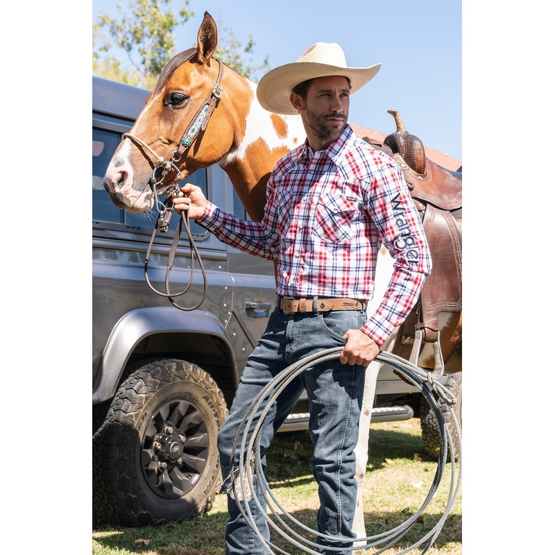 Classic western long sleeve shirt, snap closure, western chest pockets (one with pen holder), western front and back yokes, contrast trim on inside collar stand, Wrangler iconic logo sleeve embroidery100% Cotton Yarn Dyed CheckWhite/Red