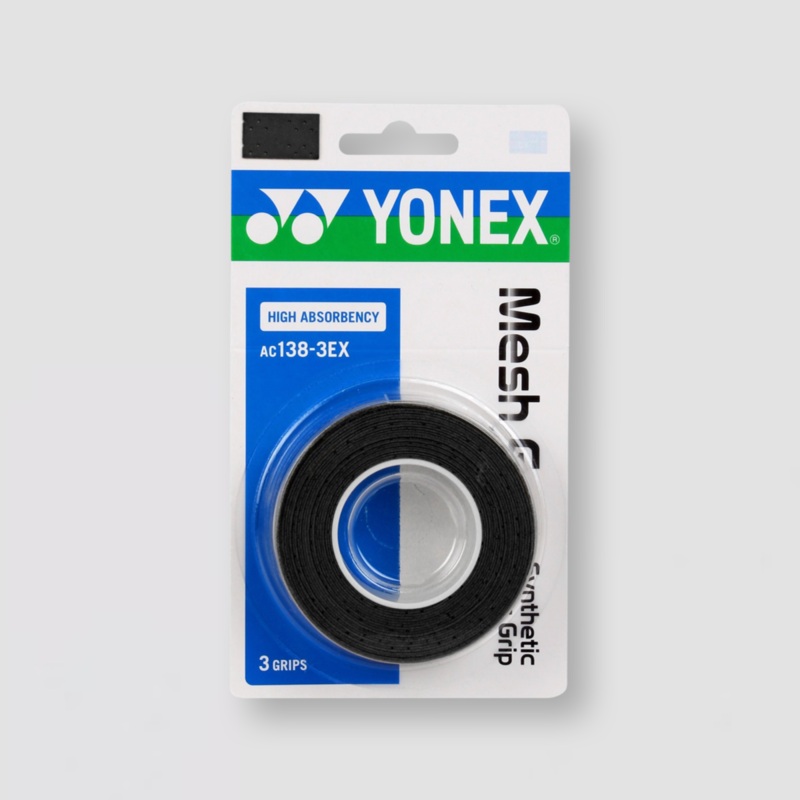 Yonex AC138EX Mesh Grap -3 grips packMesh Grap improved durability due to high-density polyurethane cells.Provides excellent sweat absorption and aeration due to the small perforations.Material: PolyurethaneWidth: 25mmLength: 1200mmThickness: 0.6mm