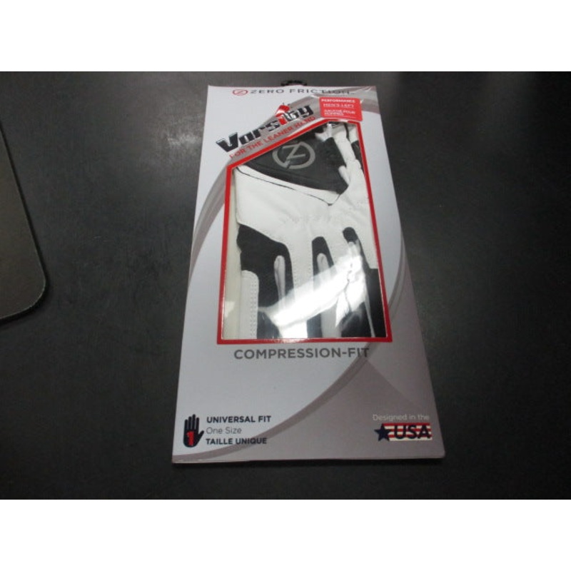 Zero Friction Varsity Golf Glove Men's Left Universal Fit - For the Leaner HandSize = OSFMColor = WHITE/BLACKBrand = Zero Friction Item Number: 26735-419 Item ID: 170755 Category: Golf Glove