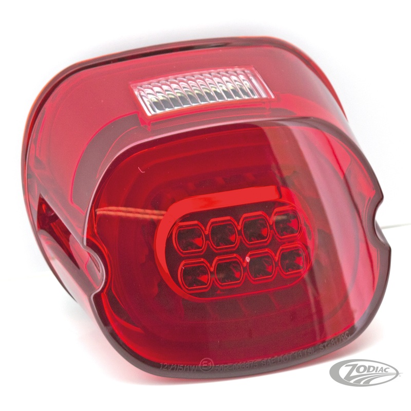 GZP Paradox LED taillight+turnsign.redThe Paradox tail light features a hi-intensity LED display for taillight, brake light and license plate illumination with optional amber LED turn signals. Available with clear, red or smoked lens, designed to fit all 1